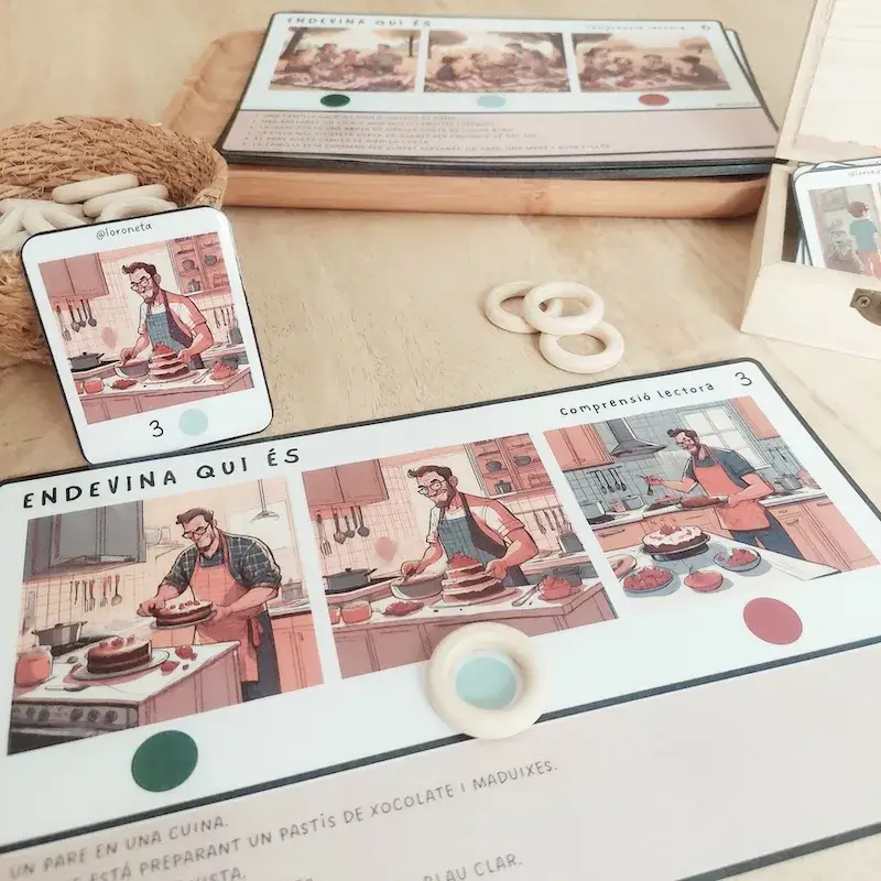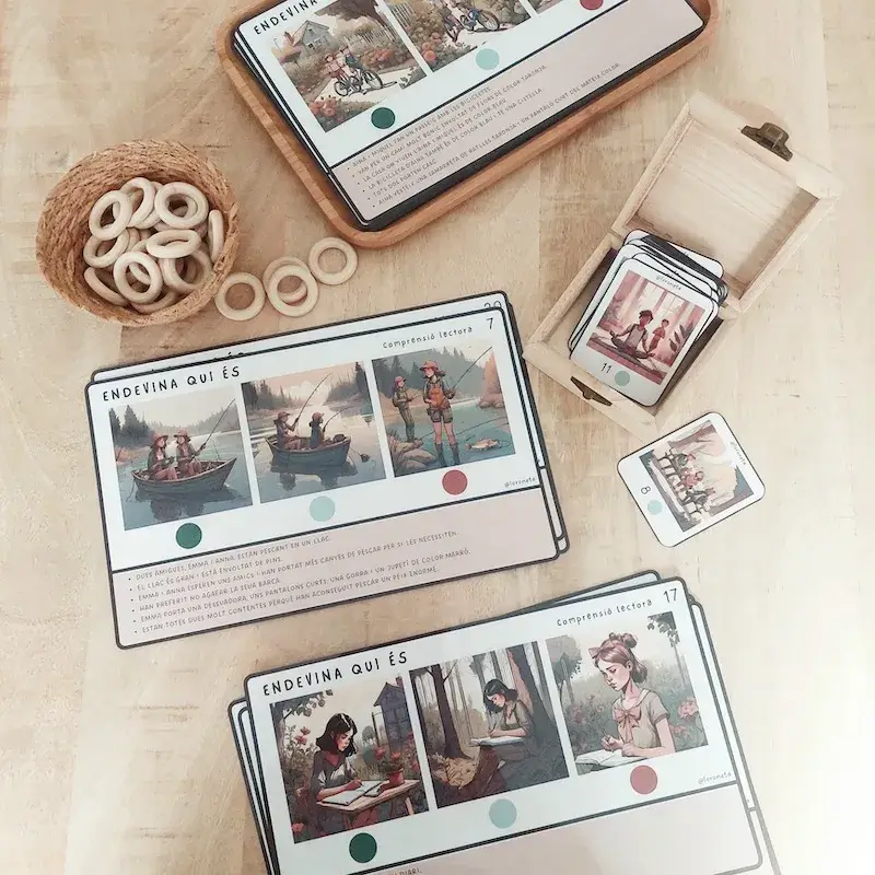 Recurs de comprensió lectora amb 20 targetes d’opció múltiple i 20 targetes autocorrectives per a facilitar l’autonomia dels infants.