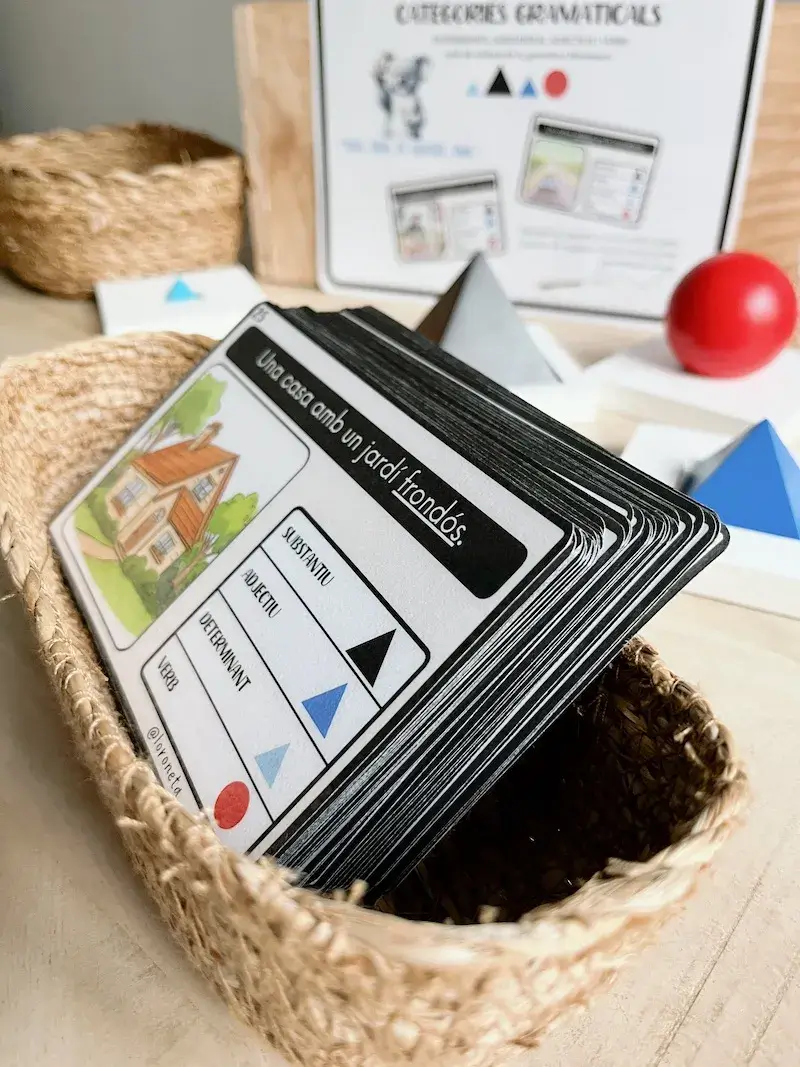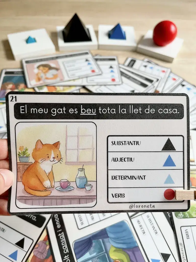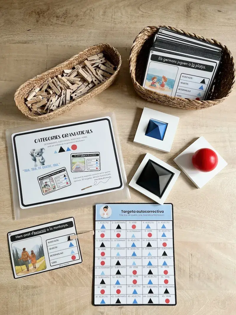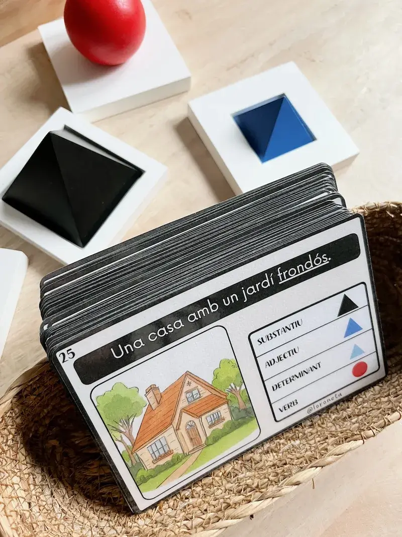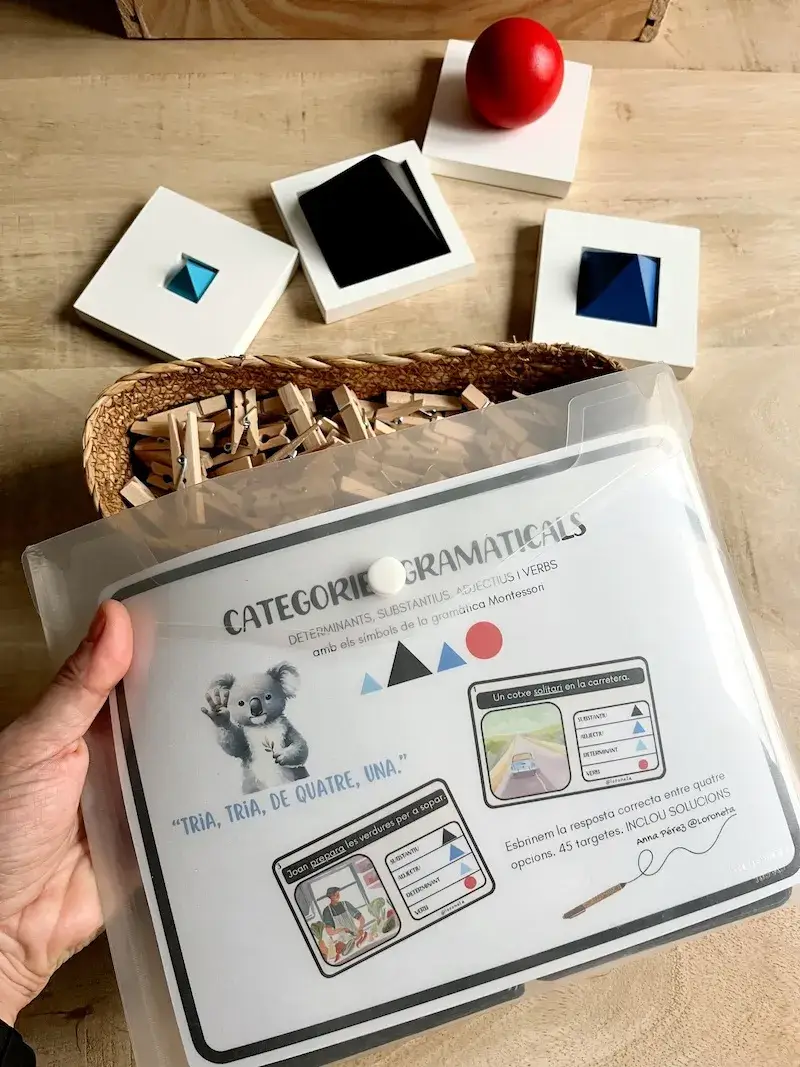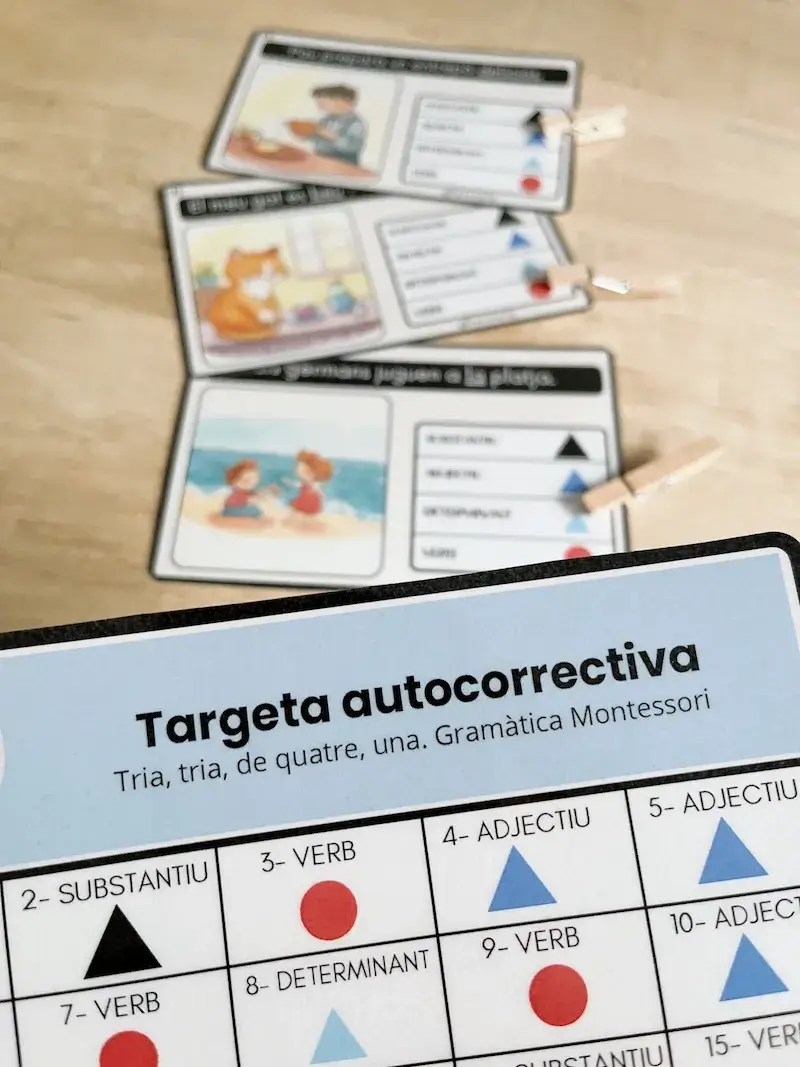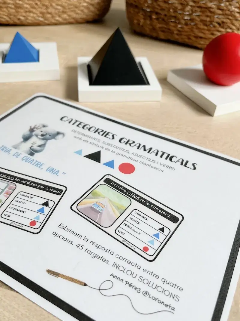 – 45 targetes visuals de resposta múltiple per treballar les diferents categories gramaticals, amb els símbols de la gramàtica Montessori.